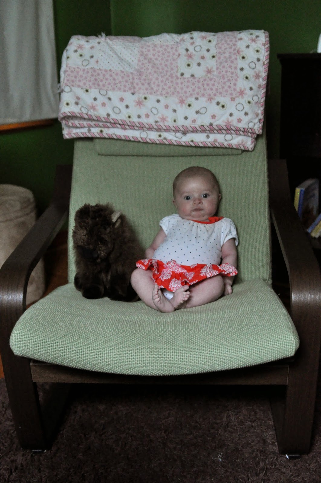 Milestones: Legitimate smiles! She's a little stingy with them, but we're seeing more and more all the time. My absolute favorite are big gummy baby smiles! Along with the smiles, she has started cooing. Adorable! Such sweet little conversations she has. She also found her hands and thinks they're extra tasty. Oh, and we took our first trip out of town to visit my family in Wisconsin. She was a trooper, making the 4 hour trip with no major meltdowns and charming everyone.